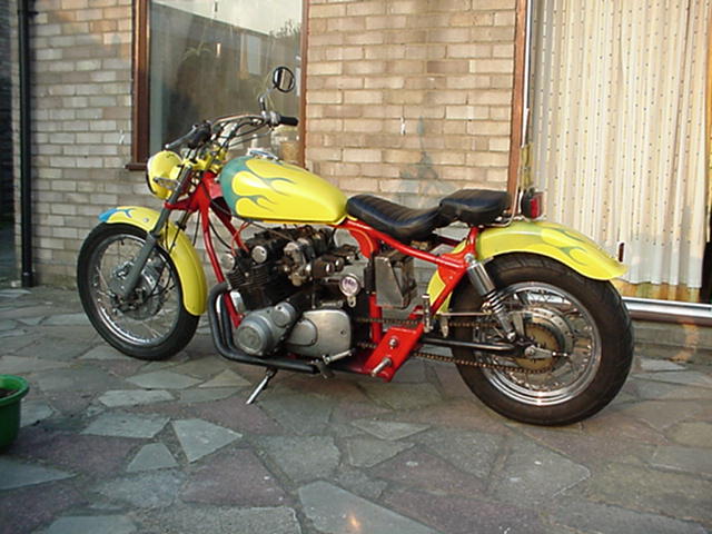 It started life as a Suzuki GT550 2 stroke triple bought from a mate for a bottle of Vodka. After riding it for a while as standard I decided to chop it. I purchased a GS 750 engine from a breakers in Ipswich and as I was intending to make a custom frame my self I told DVLC that I had fitted the engine long before I informed them of the change of frame. So I was able to keep the original reg no. (L) so it is classed as a historic vehicle and has free tax. It's ok in straight lines but, because it is low, corners are taken carefully especially two up.